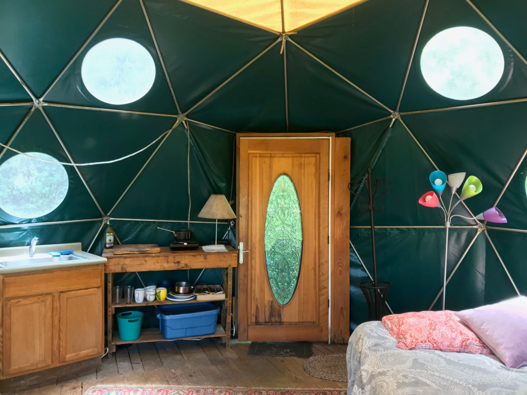 The dome is rustic and primitive. The deluxe outhouse is a few steps away. There’s an outdoor shower on the deck, a comfy queen sized bed, and a kitchenette with a mini-fridge and hot plate.